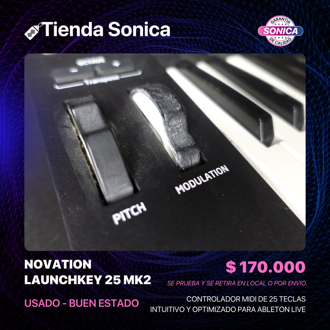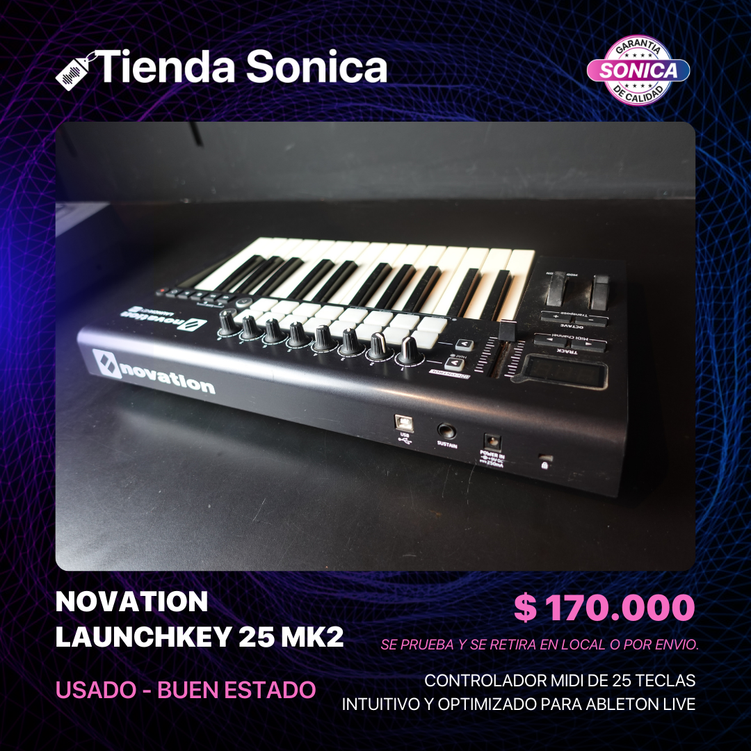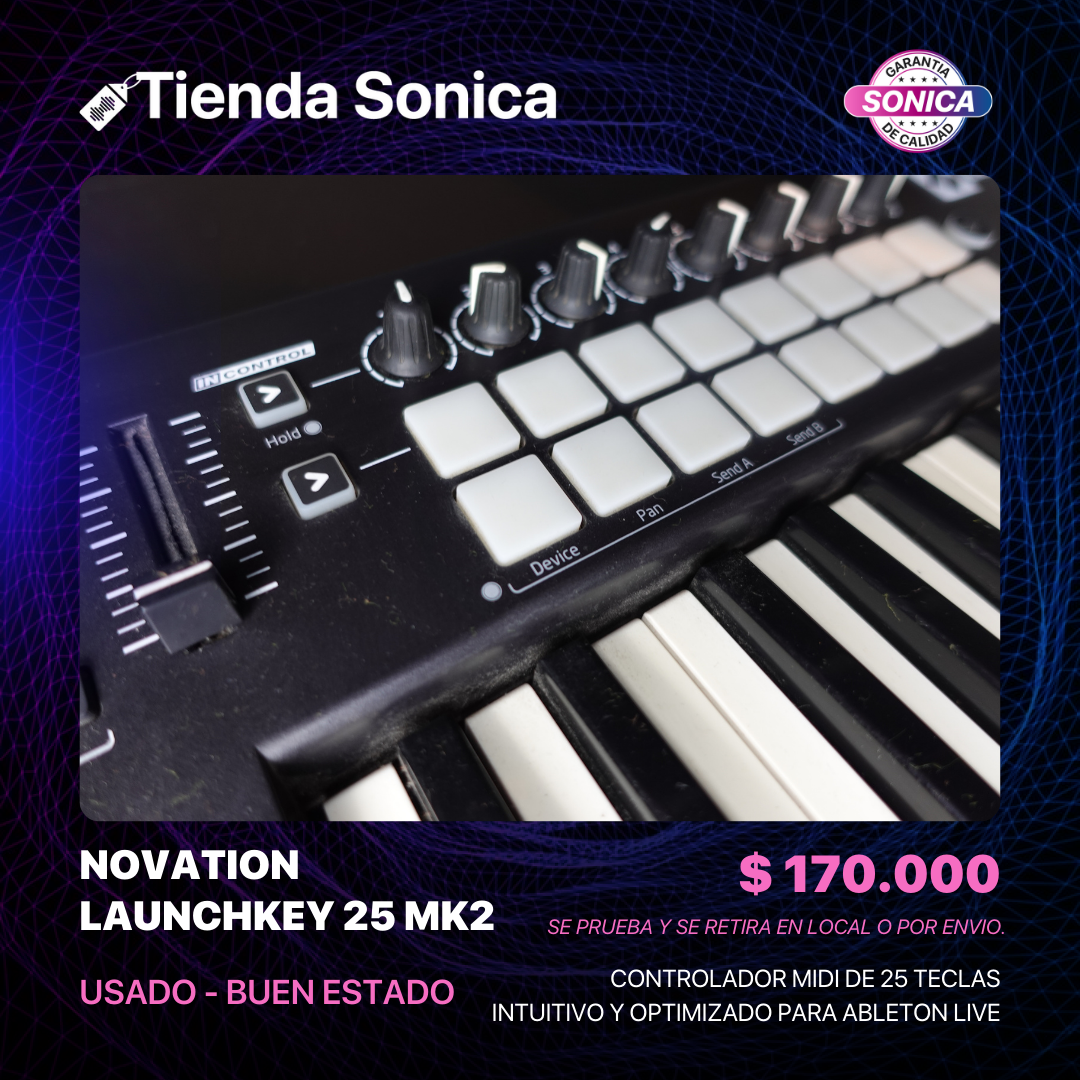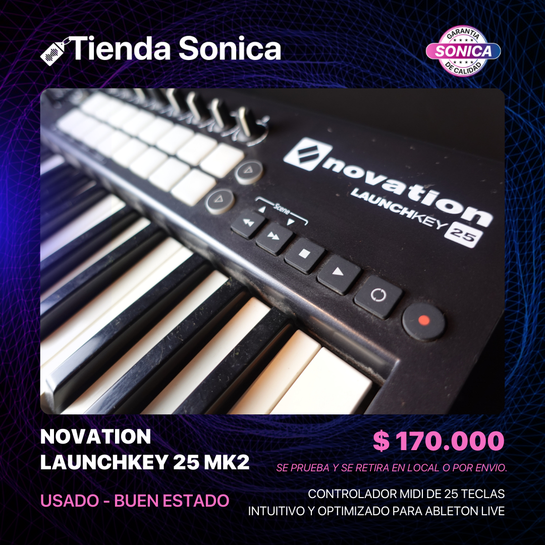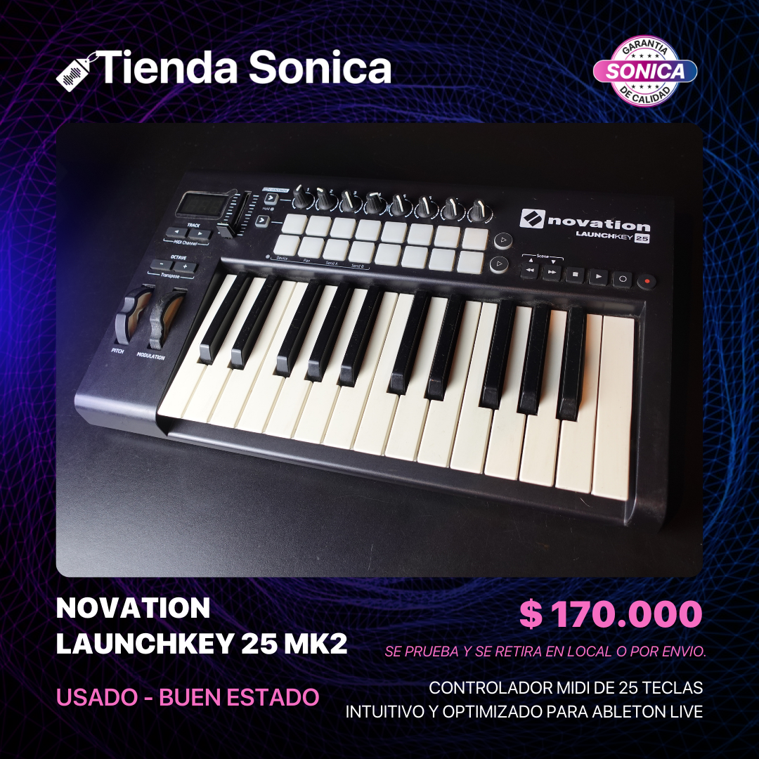 El Novation Launchkey 25 MK2 es un controlador MIDI portátil de 25 teclas diseñado para integrarse a la perfección con Ableton Live y otros DAWs populares. Con pads retroiluminados, controles intuitivos y un diseño compacto, es ideal para músicos y productores que buscan una solución versátil para la creación musical.